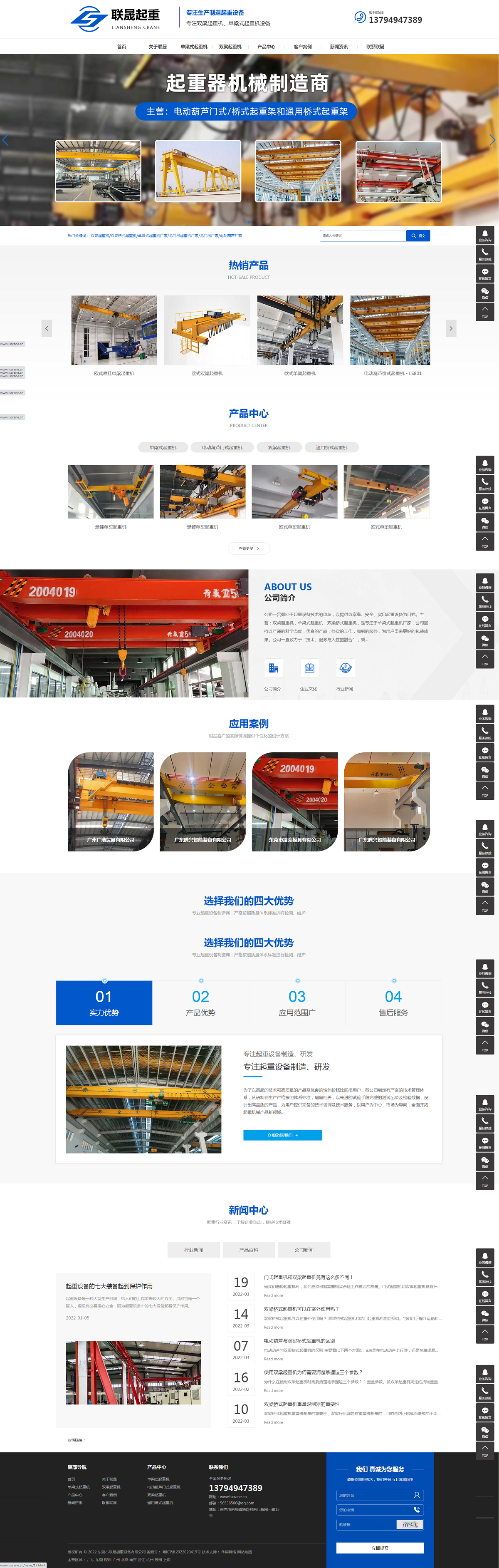 东莞市联晟起重设备有限公司 公司一贯倾向于起重设备技术的创新,以提供效率高、安全、实用起重设备为目标。主营:双梁起重机,单梁式起重机,双梁桥式起重机,是专注于单梁式起重机厂家,公司坚持以严谨的科学态度,优良的产品,务实的工作,周到的服务,为用户带来更好的包装成果。公司一直致力于“技术、服务与人性的融合”,秉持“信誉至上”原则。并将更加不懈努力,换取更多客户爱戴,衷心希望各界用户更多的支持和帮助。公司不断增加技术投资,不断进行技术革新,提高产品科技含量,吸收和消化国内外起重行业的创新设计和先进工艺,全力打造我公司产品质量的新起点,满足市场对起重设备的新需求,与国际同类产品接轨,占领市场制高点。