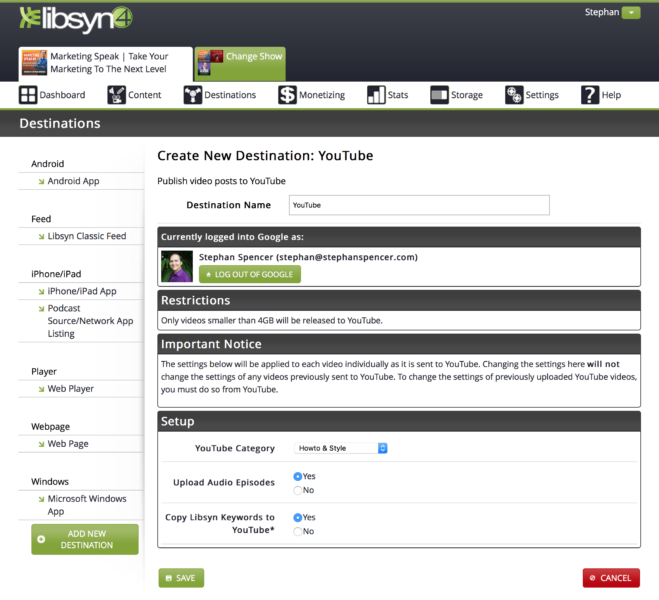 您没有理由不播放您的播客录音,并且很容易将其转换成YouTube视频。有很多文件转换器和视频编辑软件可以将您的音频文件转换为视频。事实上,如果你像我这样主持Libsyn,那么你可以使用他们内置的发布到YouTube的功能(见屏幕截图)。 您可以选择在播客播放时记录播客参与者的实际视频,并在YouTube上使用该视频,或者与您的品牌叠加幻灯片,有趣的图像,支持播客在特定时间讨论的图表以及音频顶部的信息来创建视频演示。