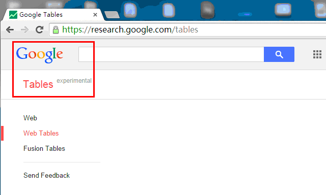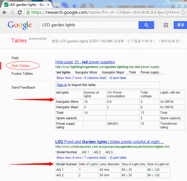 注意在 Google Tables 中,默认为网页中的表格(以上红色字体 Web Tables)。下面还有 Fusion Tables可选。